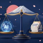 日本のAI関連法規のイメージ。中央に金色の天秤、左皿に「AI」と書かれた青く輝く球体、右皿に書類の束。背景に富士山と桜の花、五重塔のシルエット。AIと法規制のバランスを象徴
