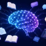 LLM(大規模言語モデル)のイメージ図。中央に脳型のニューラルネットワーク、周囲に書籍・文書・チャットバブル・コードが集まり、データを学習している様子